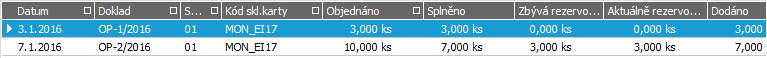 Pokud bychom si seznam omezili jen za pohyby z nevyřízených objednávek, pak bychom obdrželi jen jen objednané množství z OP-2/2016, jelikož OP-1/2016 se po vyexpedování automaticky označila za vyřízenou.