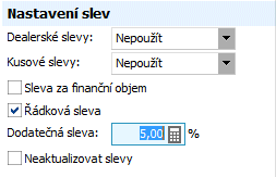 V sekci Nastavení slev v subzáložce Hlavička nastavíme slevy následovně: Dealerskou slevu zadáme "Nepoužít", Dodatečnou slevu zadáme 5% a zatrhneme Řádkovou slevu.
