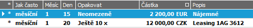 Příklad zadaných plateb k opakování měsíčně k 15-tému a k 20-tému v měsíci s neomezeným opakováním. Hvězdička vyjadřuje, že dané opakované platby jsou stále platné, tj. dosud nevypršely (podle počtu opakování).