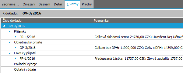 1. Zkontrolujeme si, jak se promítlo zadání příjemky podle objednávky vydané (tj. import objednávky vydané do příjemky) na oba doklady. Otevřeme agendu Objednávky vydané. Viz modul Nákup→záložka Objednávky a dodávateľské cenníky. Prohlédněte si záložku X-väzby objednávky OV-3/2016, kterou jste importovali do příjemky dle textu výše. Máte v záložce X-väzby uvedenu příjemku, jak je naznačeno na obrázku?