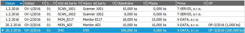 Dodavatel dodal objednané monitory dle OV-3/2016, kterou jsme si vystavili v kap. Objednávka vydaná podle objednávky přijaté a na kterou jsme zaevidovali přijatou fakturu. Současně nechť dodal částečně zboží objednané dle OV-2/2016 a to 15 ks MON_EI17. Dodané zboží si nyní přijmeme do skladu. Příjemku do skladu můžeme buď vystavit samostatně nebo ji můžeme vystavit na základě importu jiného dokladu - v tomto případě objednávky vydané (pak budeme mít na takových objednávkách vydaných k dispozici informaci o již dodaném množství).
