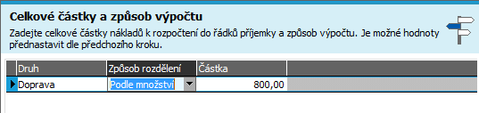 Po dokončení průvodce rozpočtením se celková částka na dopravu rozpočetla do jednotlivých řádků příjemky v poměru množství: