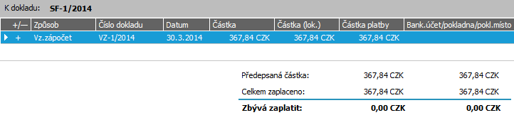 Pokud není v seznamu plateb vystavený doklad vzájemného zápočtu ani po provedeném občerstvení, pak jste jej vystavili jako úhradu jiného dokladu. Zkontrolujte variabilní symbol v řádku Typu pohledávka Vzájemného zápočtu. Pokud je v seznamu plateb, ale sankční faktura není zcela uhrazena, pak byl vzájemný zápočet (případně hrazená sankční faktura) vystaven na jinou částku, než uvádíme v příkladech.