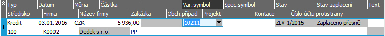 Řádek bankovního výpisu - platba zálohy. V položce Kontace vybereme z číselníku nabízených předkontací (v základní podobě jsou defaultně dodávané). Doporučujeme nějakou předkontaci vybrat, jelikož pak se doklad v účetních žádostech objeví již předkontovaný, což využijeme dále v části Zaúčtování žádostí.