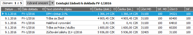 Řádky téhož typu z hlediska účtování se shodnými účetními položkami se sloučí. Zaúčtování dokladu lze prohlížet také přímo z agendy zdrojového dokladu v záložce Zaúčtovanie, odkud lze funkcí Účetnictví i vyvolat žádosti a rovnou provést zaúčtování do deníku, což si provedeme. Pokud jsme zaúčtování ručně nezměnili, bude výsledek ve vyvolané agendě žádostí (v tomto případě rovnou omezené za náš doklad) následující: