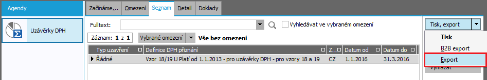 V dalším kroku odsouhlasíme export pro aktuální záznam uzávěrky a vybereme export DPH přiznání.