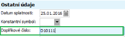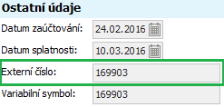 U výstupních dokladů (např. FV) se vykazuje Doplňkové číslo v hlavičce dokladu, pokud je vyplněno, jinak je uváděno interní číslo dokladu (např. FV-1/2016). Aby se Doplňkové číslo v dokladech nabízelo k vyplnění, nastavili jsme si parametr v agendě Firemních údajů viz kap. Firemní údaje - nastavení dalších parametrů systému . Ve firemním nastavení lze též nastavit, aby se do KH DPH přenášel variabilní symbol, to ale v našem příkladu nevyužijeme.