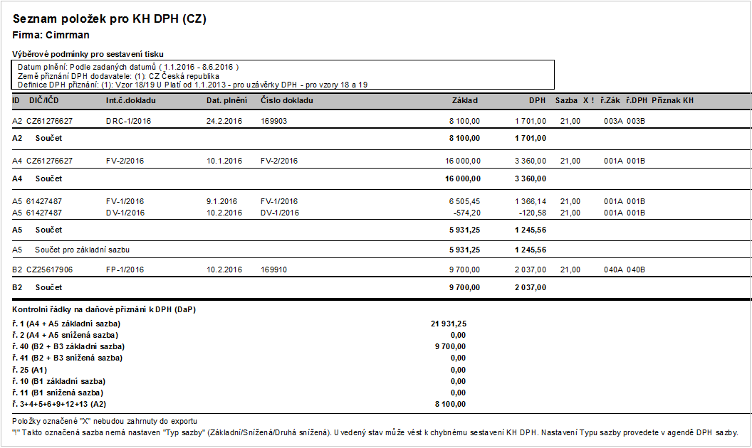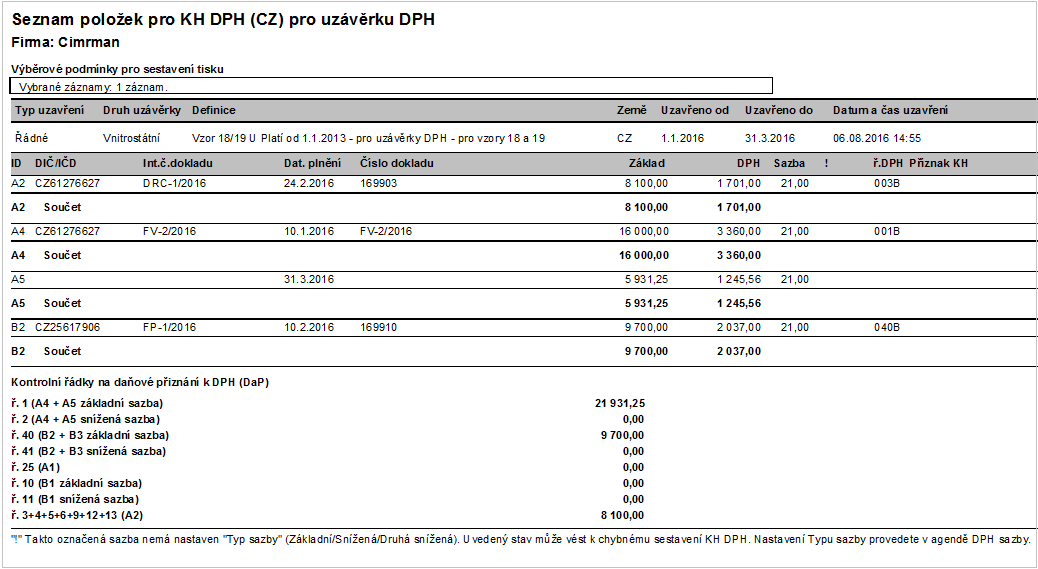 Report položek KH DPH v agendě Uzávěrek DPH, které jsou součástí KH DPH.