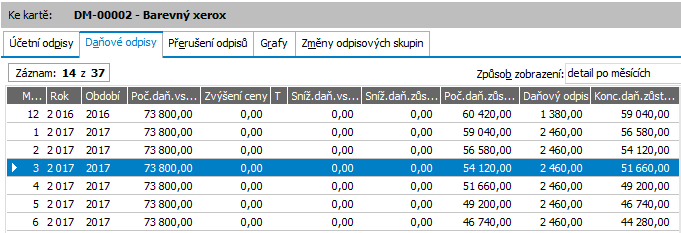 Po uložení dokladu proběhne automatické přepočtení odpisů. Tento doklad se však nepromítne nijak do odpisů, jelikož částka nepřekročila limit požadovaný pro technické zhodnocení. Prohlédneme si záložku Odpisy subzáložku Daňové odpisy ke kartě DM-00002 v agendě Dlouhodobý majetek.