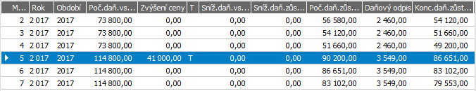 Nechť v období následujícím po zařazení, a to v 3/2017 došlo u DM-00002 k technickému zhodnocení ve výši 25000CZK. Zhodnocení však nepřesáhlo stanovený limit (aby mohlo být promítnuto do karty jakožto technické zhodnocení). V měsíci 5/2017 bylo provedeno další zvýšení ceny charakteru technické zhodnocení ve výši 16000CZK.