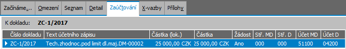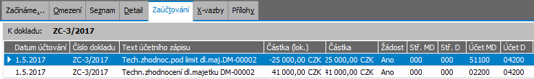 2. Nyní si prohlédneme, jak se do účtování promítl druhý doklad Změny ceny, kdy už došlo ke splnění podmínek pro uplatnění technického zhodnocení. Máte v záložce Zaúčtování vystaveného dokladu Změny ceny ZC-2/2017 zápis obdobný následujícímu? Tj. první zápis provádí odúčtování dokladu ZC-1/2017 z nákladů a druhý zápis celou částku technického zhodnocení promítne na majetkové účty: