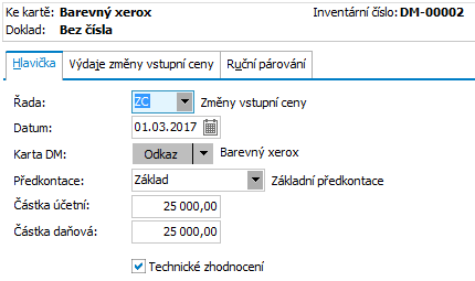 V předchozí kap. jsme si Doklad změny ceny zadali z agendy Zmeny vstupnej ceny otevřené k dané kartě majetku z agendy Dlhodobý majetok. Nyní si je zadáme přímo z agendy Zmeny vstupnej cenyotevřené samostatně. Otevřeme agendu Zmeny vstupnej ceny. Viz modul Majetok→záložka Majetok. Vyvoláme funkci F2=Nový. V hlavičce zadáme položky následovně: (tj. Odkaz na kartu DM-00002, cenu 25000CZK (ručně, tj. částku nebudeme pro jednoduchost čerpat z existujících nákupních dokladů v subzáložce Výdaje změny ceny) a zatrhneme položku Technické zhodnocení):