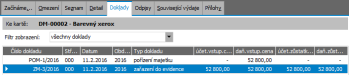 Otevřeme agendu Dlhodobý majetok. Viz modul Majetok→záložka Majetok. Pro kartu DM-00002 vstoupíme do záložky Doklady. Zde lze vidět všechny doklady zatím k dané kartě vystavené nebo si tyto filtrovat jen za vybraný typ dokladu: