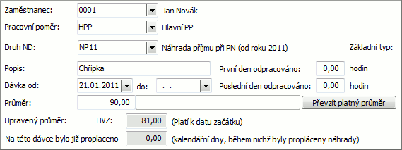Typ řádku je 1, tj. proplacení a nepřítomnost. Tj. zaměstnanec bude omluven do 31.01.2011 a současně mu bude nemocenská vyplacena za dny nemoci do 31.1. Nicméně dávka je stále neuzavřena a bude pokračovat do dalšího měsíce. Při výpočtu vyplácené částky se vychází z průměru na dovolenou upraveného dle platných zákonů. První tři pracovní dny nemoci se neproplácí, pak se proplácí 60% z upraveného průměru za každou hodinu, která by byla odpracována, pokud by zaměstnanec nebyl nemocný, tj. v našem případě 4 dny x 8 hodin x 0,6 x 81 Kč = 1555,2 Kč, po zaokrouhlení 1556 Kč.