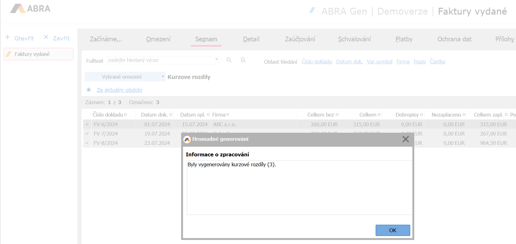 Potom sa automaticky vygenerujú kurzové rozdiely ku všetkým označeným dokladom.
