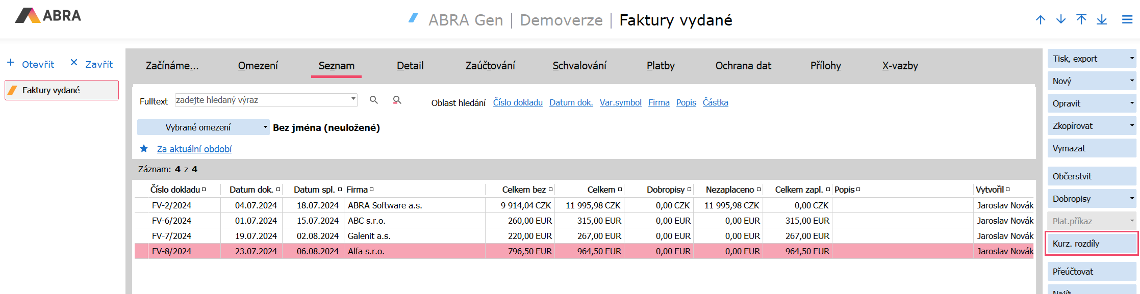 V tomto návode si predvedieme, ako je možné v systéme ABRA Gen hromadne vytvoriť kurzové rozdiely k dokladom fakturácie, ktoré sú vystavené v cudzej mene. V našom prípade si ukážeme postup pre doklady Faktúry vydané a budeme kurzové rozdiely generovať mesačne. Rovnaký postup by bolo možné aplikovať tiež na Faktúry prijaté či iné doklady.