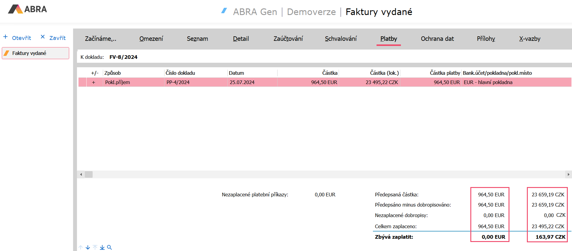 Na dokladoch si potom môžeme na záložke Platby overiť, že bol kurzový rozdiel vygenerovaný a že je doklad už vyrovnaný nielen v mene cudzej, ale tiež v mene lokálnej.