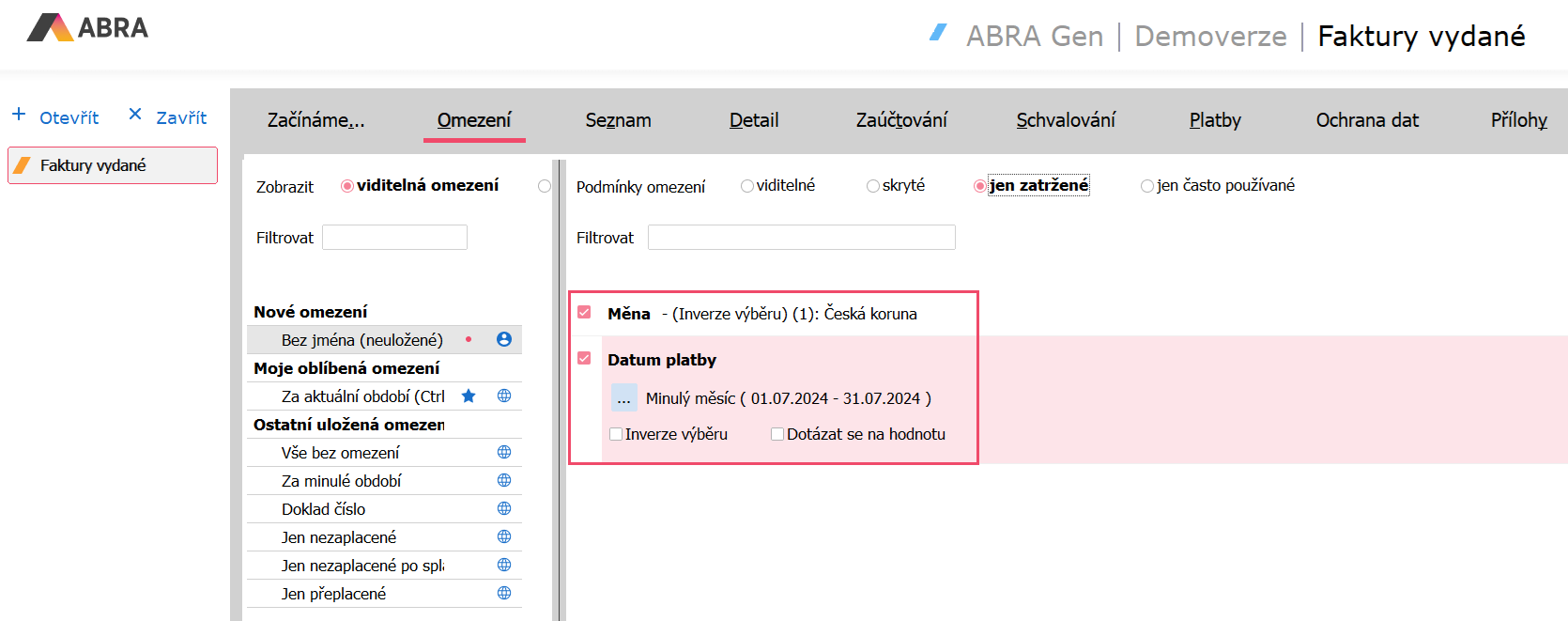 Pokiaľ chceme napríklad raz mesačne vytvoriť kurzový rozdiel ku všetkým zahraničným faktúram hromadne, vytvoríme si v agende nové obmedzenie za položku Mena, kde nastavíme lokálnu menu, v našom prípade teda CZK (česká koruna), a začiarkneme naviac položku "Inverzia výberu". Obmedzenie nám teda dohľadá všetky doklady vystavené v iných menách ako je práve CZK. A keďže chceme vygenerovať kurzové rozdiely za minulý mesiac, nastavíme si ešte obmedzenie za položku Dátum platby, kde zvolíme možnosť "Minulý mesiac".