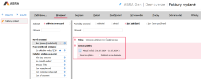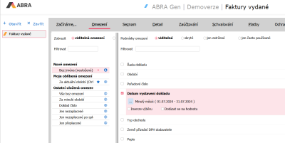 Otvoríme si agendu Faktúry vydané. Pre obmedzenie dokladov použijeme položku Dátum vystavenia dokladu, v ktorom si zvolíme obmedzenie za minulý mesiac, v ktorom chceme kurzové rozdiely vygenerovať.