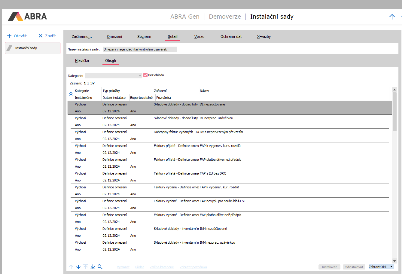 Aby sme vedeli, čo vlastne bolo do systému importom nainštalované, preklikneme sa teraz v agende Inštalačné sady do záložky Detail nainštalovanej sady a ďalej na subzáložku Obsah.