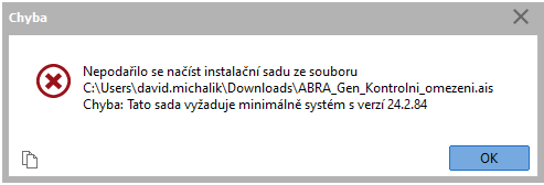 Pri importe sa môžete stretnúť s chybami. Najčastejšou chybou je, že inštalačná sada je vytvorená pre vyššiu verziu systému ABRA Gen, ako do ktorej sa ju pokúšate importovať. Príklad chyby, ktorú následne systém zobrazí, je na obrázku nižšie.
