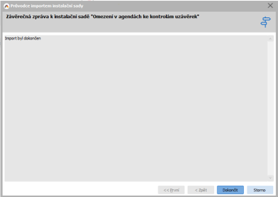 V poslednom kroku prebehne samotný import a následne nás systém ABRA Gen informuje o tom, či bol či nebol import dokončený. V našom prípade bol import inštalačnej sady úspešný. Na ukončenie sprievodcu klikneme na tlačidlo Dokončiť.