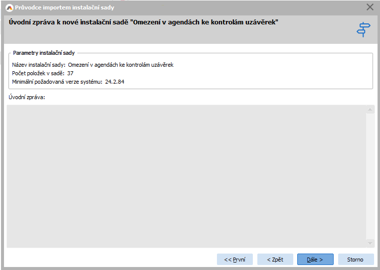 Vyberieme cestu, kde máme inštalačnú sadu umiestnenú, a zvolíme tlačidlo Ďalšie. V nasledujúcom kroku je zobrazená Úvodná správa. Ta môže obsahovať informácie o tom, čo sa inštalačnou sadou nainštaluje, čo je potrebné, na čo pridané položky slúžia a pod. alebo môže byť prázdna (ako v našom prípade na obrázku). Klikneme na tlačidlo Ďalej.