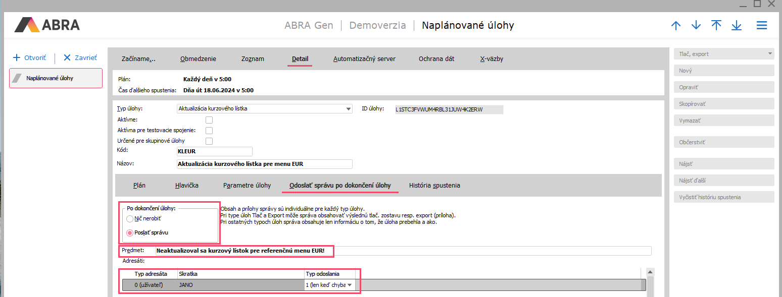 Na záložke Detail zvolíme požadovaný typ úlohy, v našom prípade Aktualizácia kurzového lístka. Ďalej vyplníme Kód a Názov naplánovanej úlohy. Na subzáložke Plán odporúčame v prípade používania denného kurzu nastaviť položku Naplánovať úlohu na hodnotu "Denne", dátum prvého spustenia a čas spustenia nastavíte podľa vašich potrieb, položku Spustiť na hodnotu "Po víkende", viď obrázok nižšie.