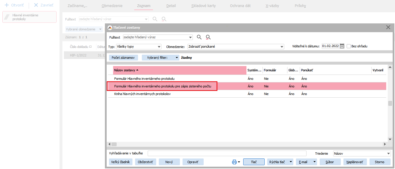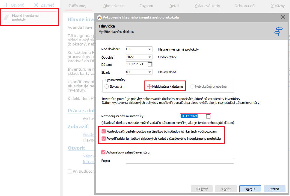 Nyní můžete připravit inventuru v agendě Hlavné inventárne protokoly (HIP). Doporučujeme zvolit Neblokační k datu s možností přidávat položky (pro případ, že byste ve skladu fyzicky našli něco, o čem systém eviduje nulové množství).