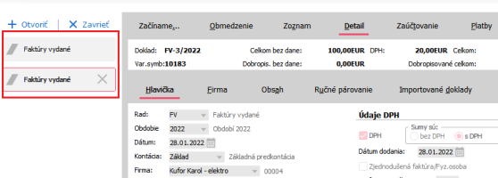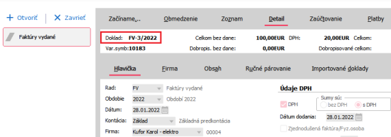 Do poľa pre vyhľadávanie napíšeme hľadané číslo dokladu vrátane obdobia, napríklad FV-3/2022 a stlačíme Enter.