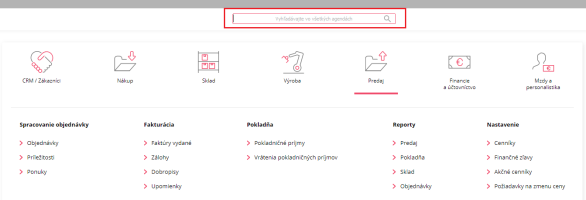 Po prihlásení do ABRA Gen sa nám otvorí úvodné okno systému pre spúšťanie agend. Tu je pole pre vyhľadávanie.