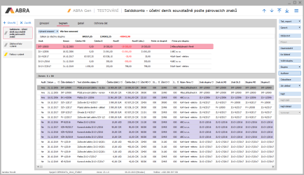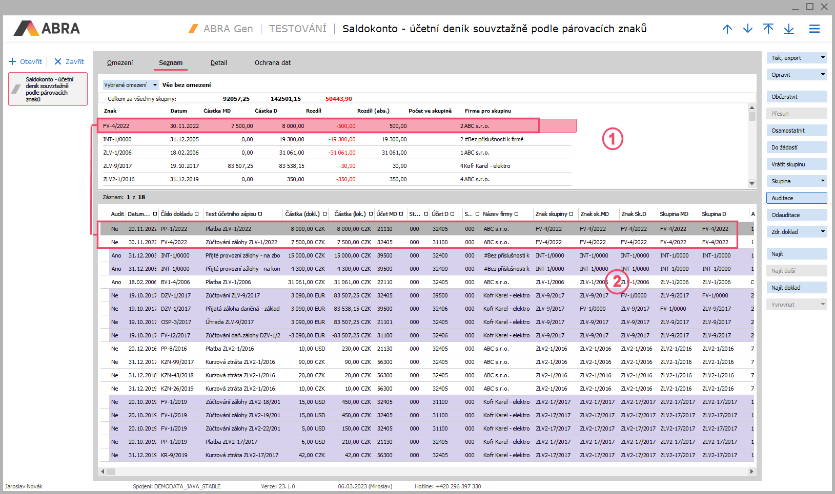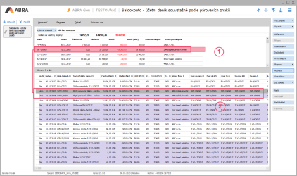 Po stisku tlačítka Získat záznamy uvidíme v záložce Zoznam výpis záznamů podobný následujícímu. V horní části je Seznam saldokontních skupin podle párovacích znaků (1), ve spodní části Seznam účetních záznamů v jednotlivých skupinách podle párovacích znaků (2). Účetní záznamy ze spodního seznamu patřící do stejné skupiny jsou u sebe. Aby se ve spodním seznamu dalo lépe odlišit, kde začínají a končí záznamy z jedné skupiny a kde už začínají záznamy z další skupiny, jsou záznamy z různých skupin ve spodním seznamu střídavě podbarveny a nepodbarveny (barva zvýraznění skupin je závislá na stylu vzhledu systému ABRA).