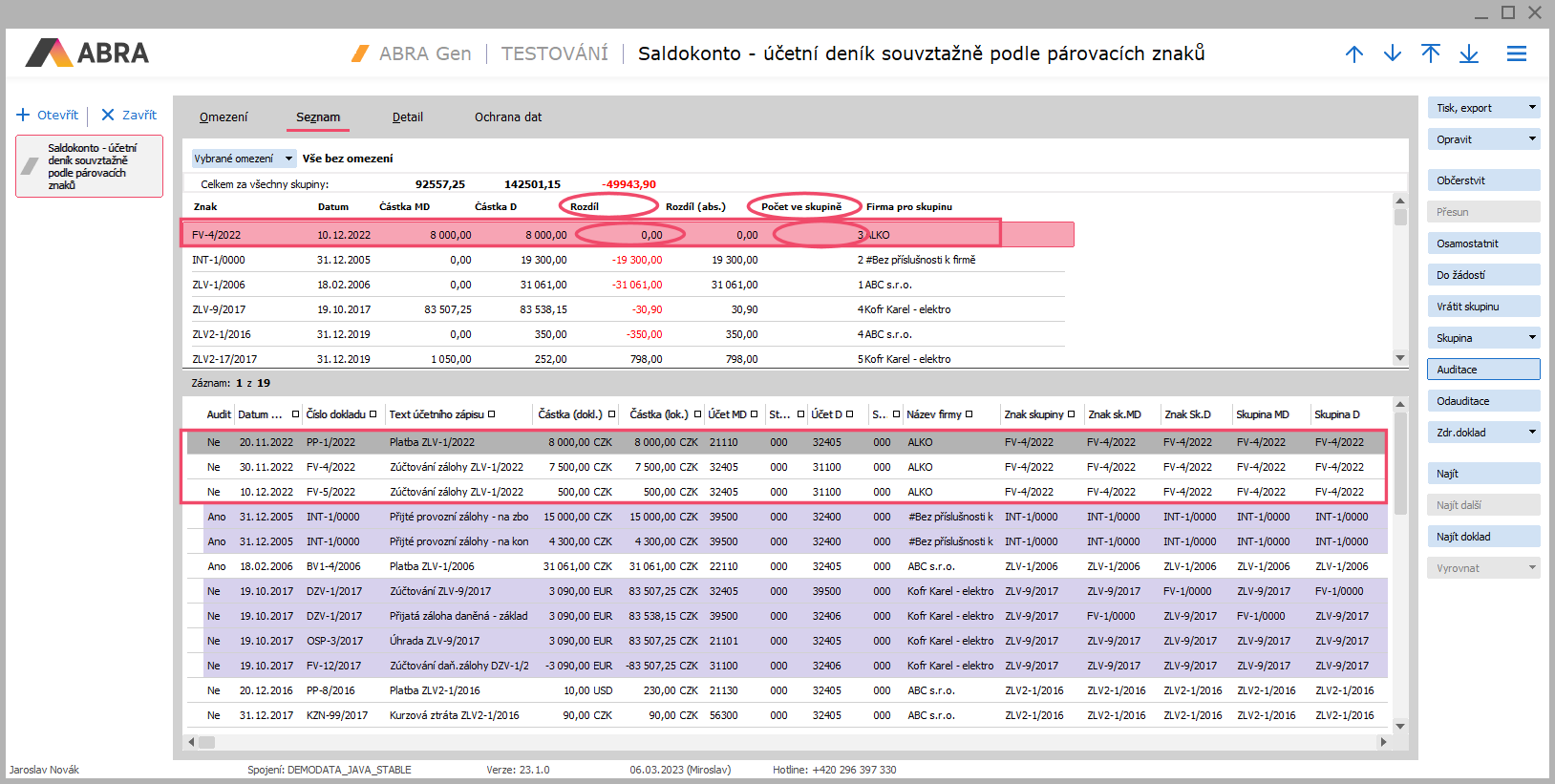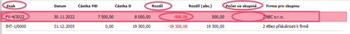 Na detailu z obrázku výše vidíme, že první skupina v pořadí se znakem FV-4/2022 obsahuje 2 účetní záznamy a rozdíl je -500 (tj. saldo dané skupiny pro účty záloh 324xx, za které jsme si omezili, je -500):