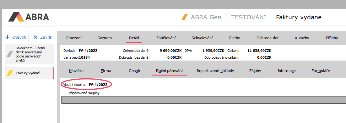 V našem případě byl první doklad ze skupiny faktura. Tudíž přidělený účetní párovací znak je její číslo FV-4/2022. To i vidíme v její záložce Rozúčtovanie