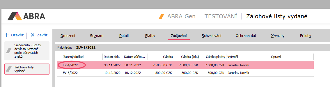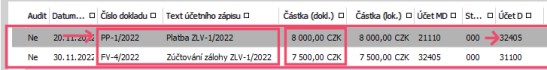 Zde vidíme, že ZLV-1/2022 byl opravdu zúčtován do faktury FV-4/2022 ve výši 7500CZK. Na vedlejším obrázku pro srovnání vidíme znovu promítnutí tohoto zúčtování do účetnictví a "naší" saldokontní skupiny. Zúčtování zálohy se standardně účtuje na straně MD na účet 324xx, proto se nám tento účetní pohyb objevil ve výpisu saldokonta za účty 324xx.