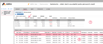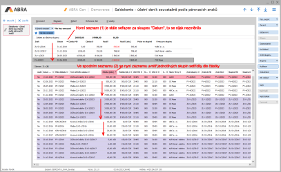 u sloupce Částka (lok.). Tím se dle částky setřídí záznamy v rámci jednotlivých skupin. Setřídění horního seznamu (1) zůstane, jak bylo, nijak se tím nezmění. Pozor, důležité je, si uvědomit, že dole zvolené třídění se aplikuje vždy JEN na záznamy UVNITŘ skupin. Nikoli přes celý viditelný seznam všech vypsaných záznamů (to by nedávalo smysl, saldokontní skupiny by se tím rozbily).