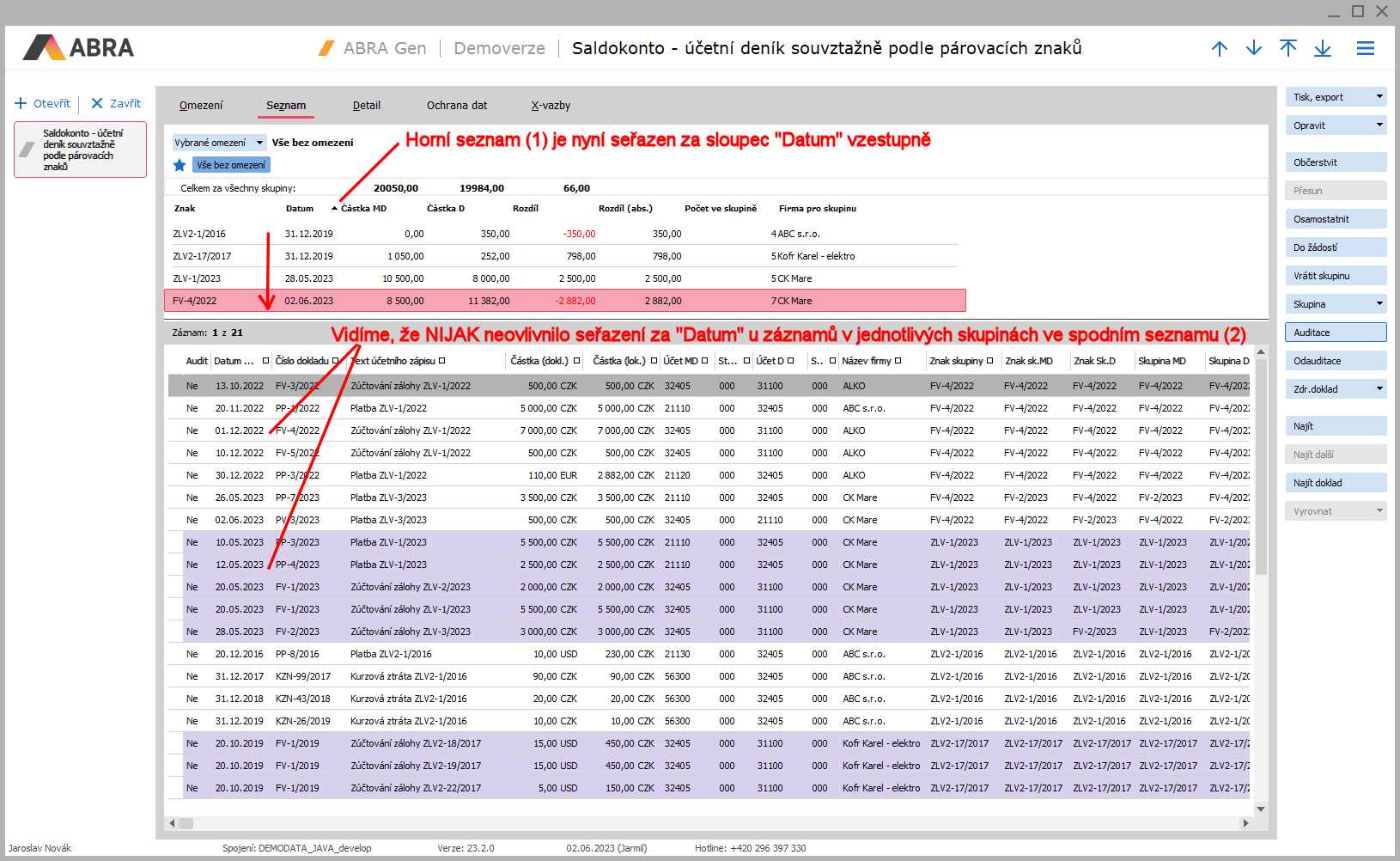 Ve spodním seznamu (2) jsou nyní záznamy setříděny dle částky. ALE vždy POUZE v rámci své saldokontní skupiny, NIKOLI napříč celým seznamem. Což naznačují šipky v rámci jednotlivých skupin.