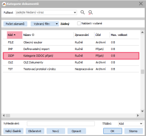 Otevřeme agendu Dokumenty a klikneme na tlačítko Nový pro vytvoření nového dokumentu. Najdeme cestu k našemu souboru a v následujícím okně zvolíme kategorii dokumentů "Kategorie ISDOC přijatý". Tímto krokem se vytvoří dokument.