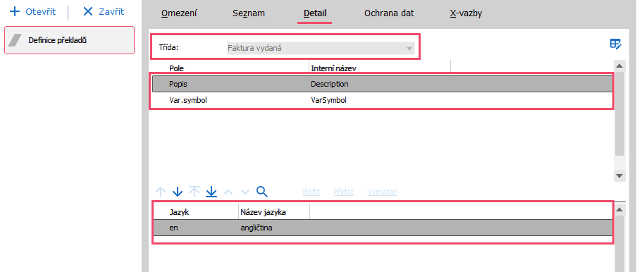 V našem návodu již máme připravenou definici překladu pro třídu business objektu Faktúra vydaná a pro anglický jazyk.