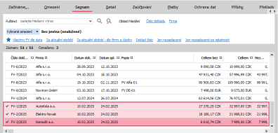 Otevřeme agendu Faktúry vydané a přepneme na záložku Zoznam, kde nejprve označíme záznamy, u kterých budeme chtít opravu provádět.