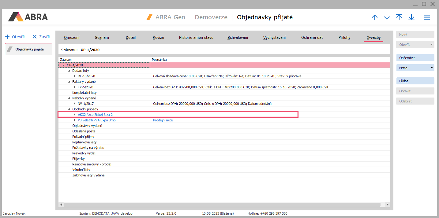 Přidáme si např. X-vazbu vybrané objednávky přijaté na vybraný obchodní případ.