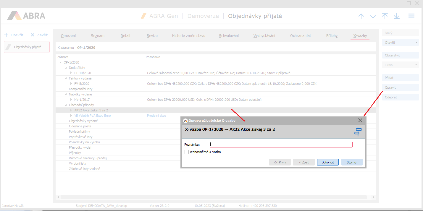 Pokud bychom chtěli poznámku právě vzniklé vazby následně doplnit či upravit, použijeme k tomu funkci Opravit. Ta se zpřístupní jen tehdy, postavíme-li kurzor na záznam s ručně vytvořenou uživatelskou X-vazbou. Poté doplníme poznámku a stiskem tlačítka Dokončit ji uložíme.