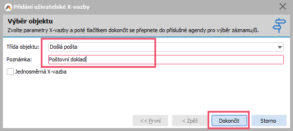 Po stisku tlačítka Přidat se zobrazí jednokrokový průvodce, kde vybereme, pro jakou třídu Business objektů chceme X-vazbu přidat. Vybereme objektovou třídu Obchodní případy, můžeme doplnit i Poznámku, která se pak u vazby zobrazí a stiskneme tlačítko Dokončit: