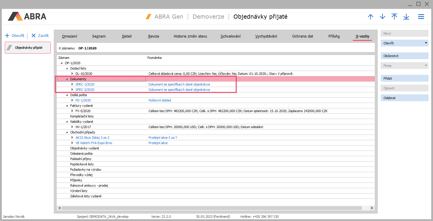 V agendách systému ABRA Gen je k dispozici mj. záložka X-väzby pro přehledné zobrazení vazeb aktuálního dokladu na jiné svázané záznamy. Dříve byla k dispozici pouze ve vybraných dokladových agendách a zobrazovala pouze vybrané typy vazeb na svázané doklady vytvořené v rámci procesní tvorby dokladů. Od verze 23.1 je záložka k dispozici ve všech dokladových i číselníkových agendách a je tedy možno přidávat vazby i na číselníkové objekty, a to jak jednorázově ručně, tak automaticky pomocí skriptování. Pro účely zákaznických úprav lze zajistit, aby se uživatelské vazby chovaly jako systémové (a uživatel je nemohl mazat). Rovněž lze pomocí skriptování rozšířit obsah záložky X-vazby o zobrazení již existujících zakázkových vazeb mezi objekty (vytvořených dříve např. pomocí X položky s odkazem). Také lze od v. 23.1 ovlivnit obsah poznámky zobrazované u X-vazby, a to pomocí skriptování i u systémových vazeb dodávaných výrobcem. Ukážeme si jak.