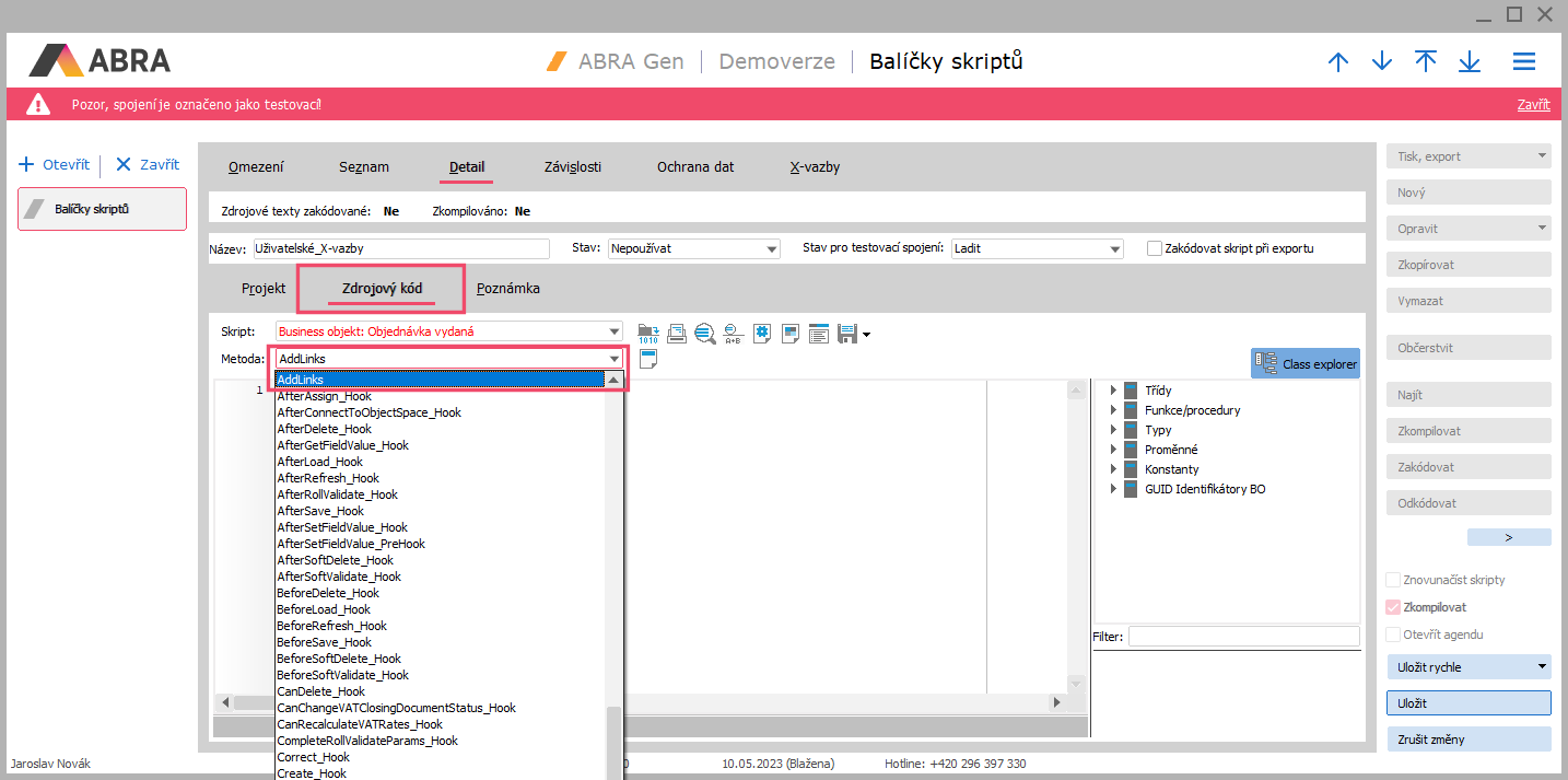 Jelikož budeme přidávat skripty, doporučujeme jako obvykle nejdříve jej vyzkoušet a odladit v Testovacím spojení a teprve poté přenést do produkčního prostředí.