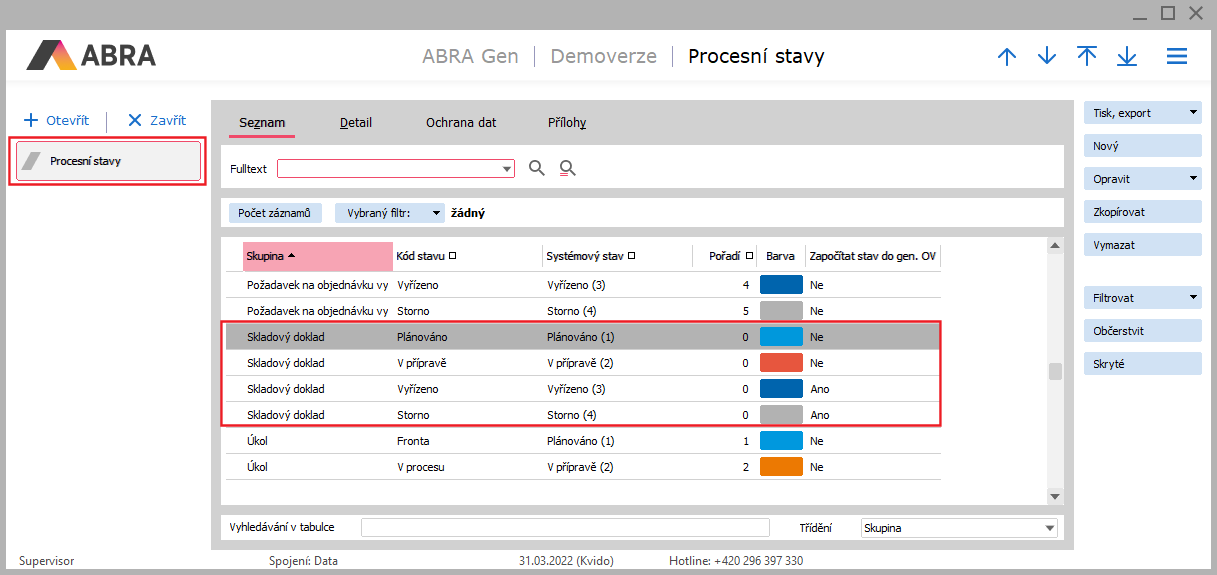 Otevřeme si agendu Procesné stavy. Vidíme, že pro skladové doklady jsou zde připraveny čtyři základní procesní stavy:
