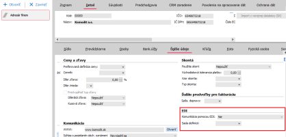 Na záznamech firem s kterými budete chtít komunikovat v rámci EDI komunikace je potřeba tuto komunikaci povolit. V agendě Adresár firiem, subzáložka Ďalšie údaje a zde volba Komunikace pomocí EDI je potřeba nastavit na hodnotu ANO. Dále je potřeba vybrat v poli Sada definic sadu, kterou budete chtít pro danou firmu použít.