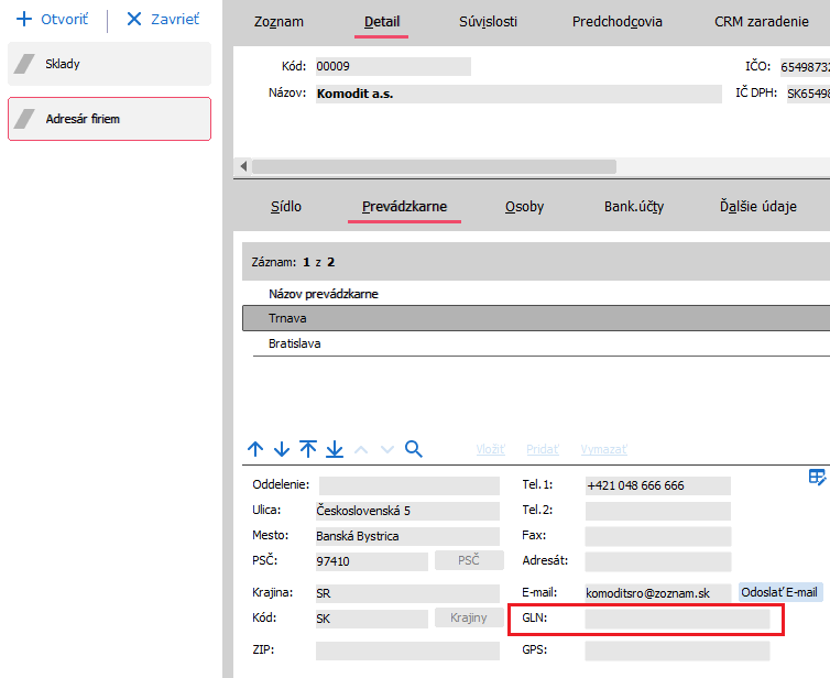 Nyní je potřeba přidat GLN obchodního partnera nebo partnerů s kterými máte smlouvu o EDI komunikaci. GLN se přidává v adrese provozovny. V agendě Adresár firiem, záložka Detail, subzáložka Prevádzkarne a zde v Adrese provozovny položka GLN.