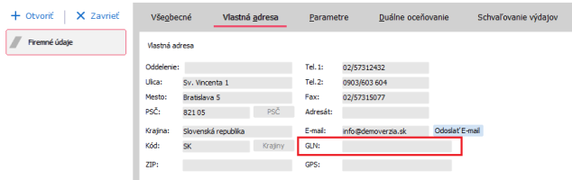 Nejprve je potřeba vyplnit vlastní Lokalizační číslo, takzvané GLN (Číslo vám přidělí EDI operátor.). Otevřete agendu Firemné údaje, záložka Vlastná adresa a zde pole GLN.