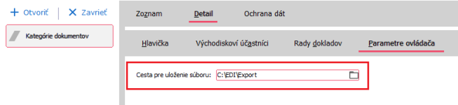 Ke kategorii dokumentu Definovatelný export na subzáložce Parametry ovladače nastavte cestu pro uložení odchozích EDI zpráv. (např. C:\EDI\Export))